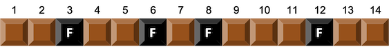 초콜릿 공장의 컨베이어 벨트에서 아래와 같이 한 칸 단위의 초콜릿 14개가 한 줄로 나왔다. 공정 중에 문제가 생겨서, 어떤 단위 초콜릿은 흠이 있는 불량품(아래 그림에서 F로 표시)이다. F 표시가 없는 단위 초콜릿은 정상적인 단위 초콜릿이다.