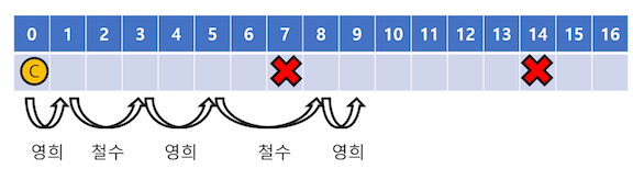 게임 시작 시 동전은 일렬로 된 빈칸의 0번 칸에 놓여 있다. 동전 이동 규칙은 아래와 같다.