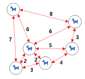 그림과 같이 여섯 마리의 강아지가 한 섬에 한 마리씩 있다. 그림에서 화살표는 섬과 섬 사이를 오갈 수 있는 뱃길이며 각 숫자는 이동에 필요한 연료의 양을 나타낸다. 배도 여섯 척이 있어 섬마다 한 척씩 대기하고 있다. 모든 배는 한 번에 최대 다섯 마리를 태울 수 있을 만큼 크다.