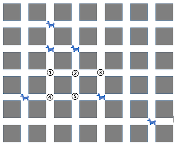 그림과 같이 한 칸의 가로세로 길이가 동일한 격자 형태의 통로에 여섯 마리의 강아지가 얌전히 앉아 있다. 강아지들은 모두 얌전해서 제자리에서 움직이지 않지만 만약을 대비해서 각 강아지에 목줄을 걸어 한 사람이 여섯 줄을 모두 잡고 있으려고 한다.