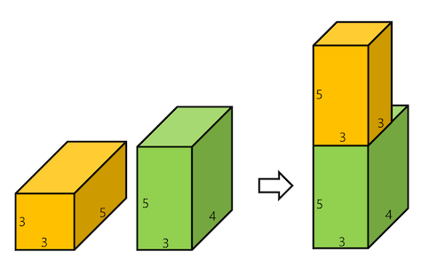 예를 들어, 아래 그림 좌측에서 보인 것처럼 두 블록의 크기가 각각 (3,5,3)과 (3,4,5)일 때, 그림 우측에 보인 것처럼 쌓으면 높이가 10이 되고, 이는 가장 높게 쌓은 모양이다.