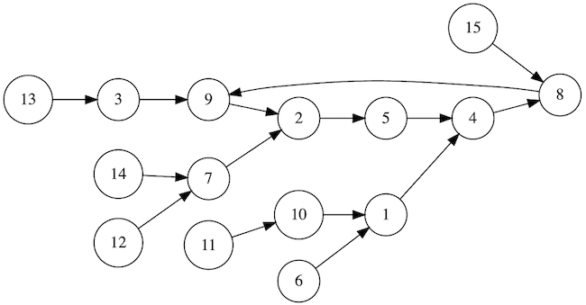 아래와 같이 정점이 15개이고, 모든 정점에서 출발하는 간선이 정확히 1개씩 있는 방향 그래프가 있다. 정점에는 1부터 15까지의 번호가 붙어 있다.