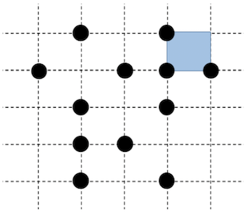 직사각형 모양의 울타리로 나무를 감싼다면, 둘레의 길이가 4인 경우 그림의 파란색처럼 최대 세 그루를 감쌀 수 있다.