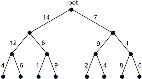 일부 간선의 가중치를 증가시켜 루트 노드로부터 모든 잎 노드까지의 경로 길이를 같게 만들고자 한다. 단, 증가시키는 가중치의 합이 최소가 되도록 하길 원할 때, 증가시키는 가중치(최종 가중치 - 원래 가중치)의 합은 얼마인가?